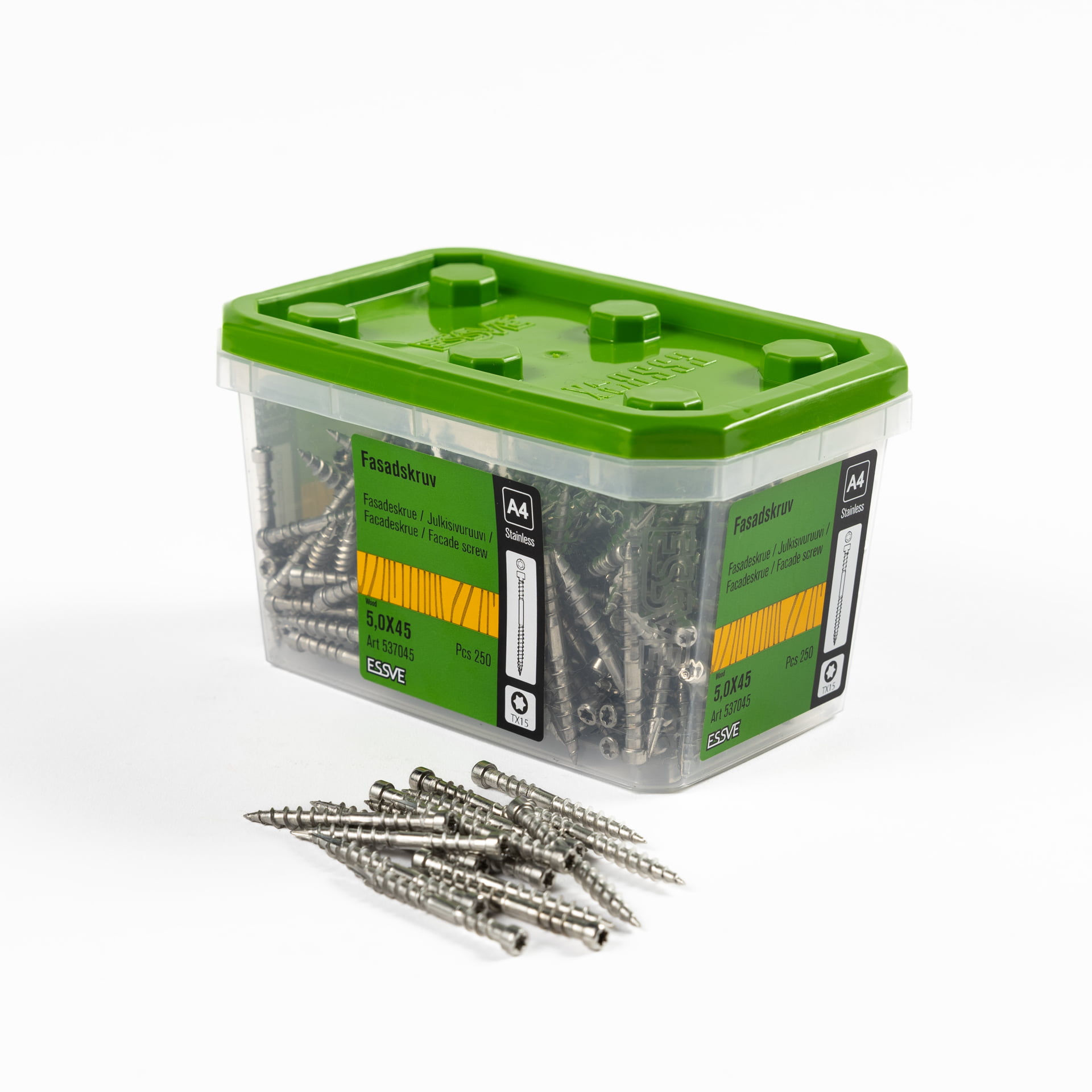 Skrūves izgatavotas no skābesizturīga nerūsējošā tērauda A4 un paredzētas īpašai videi, piemēram, fasādēm no ekskluzīvas koksnes, termiski apstrādātas koksnes, fasādēm ar pretkorozijas virsmas apstrādi, piemēram, dzelzs vitriolu, un fasādēm piekrastes zonā.