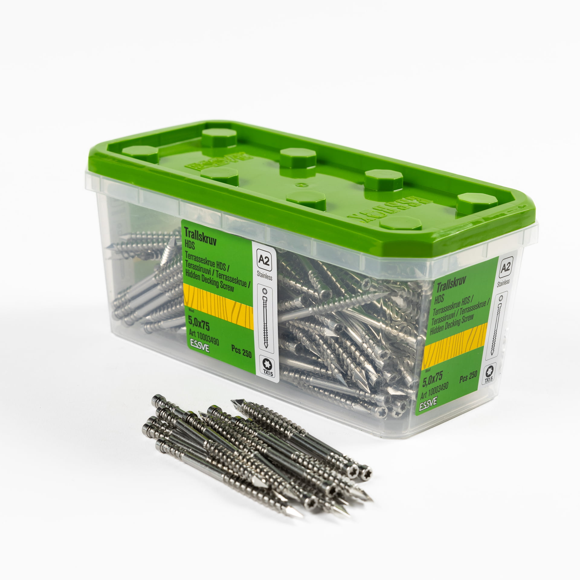 ESSVE HDS terases dēļu skrūves A2 paredzētas zem spiediena impregnētu koka ieklājmateriālu slēptai montāžai. Skrūves ieskrūvē no ieklājmateriāla sānu malas, izmantojot speciālu uzgali un montāžas instrumentu. Terases dēļu skrūves 5,0 x 75 mm paredzētas šāda biezuma dēļiem: 30 - 40 mm un maks. platums 145 mm, izmantojiet montāžas instrumentu 110 - 150 mm platiem dēļiem.